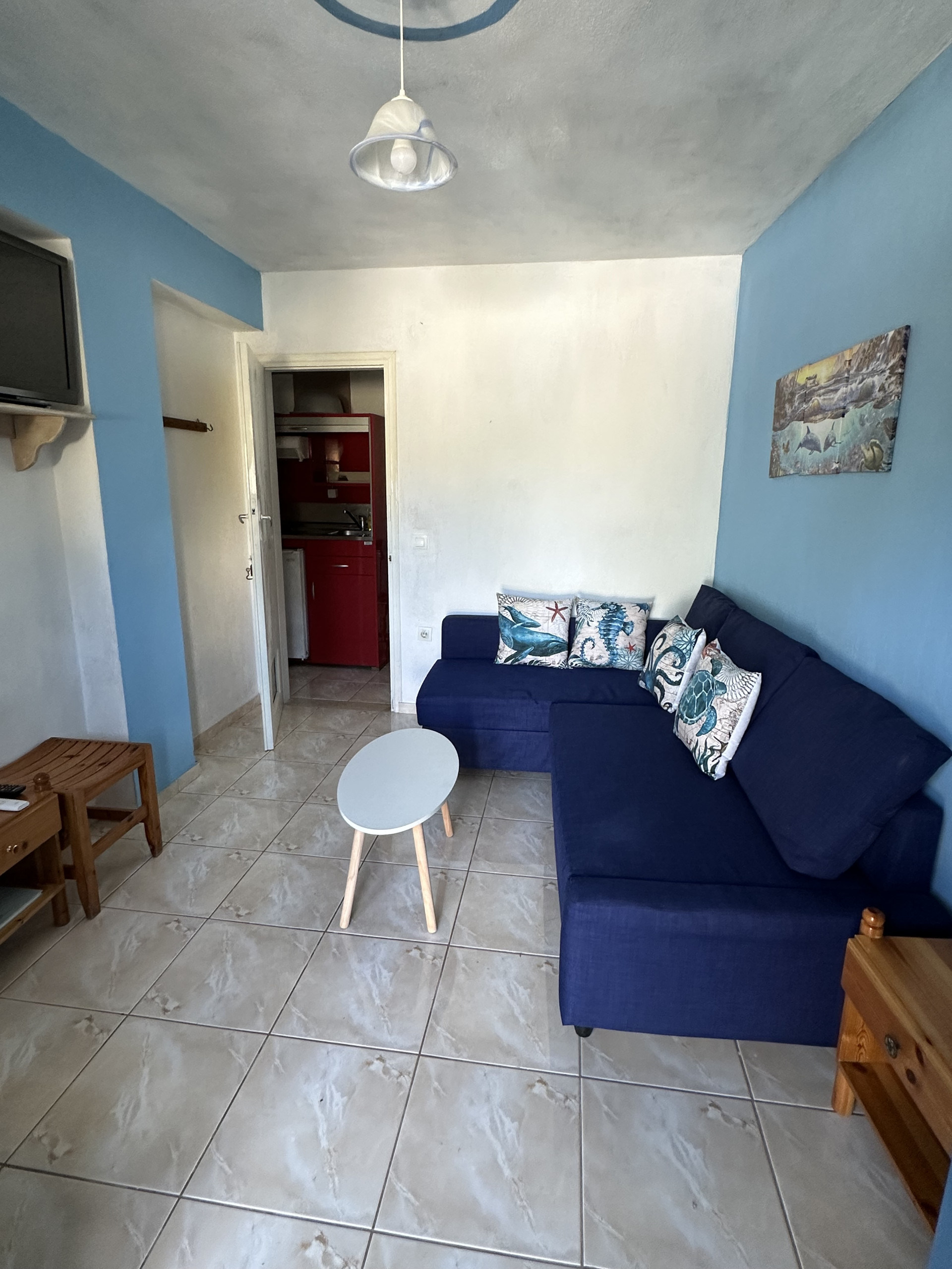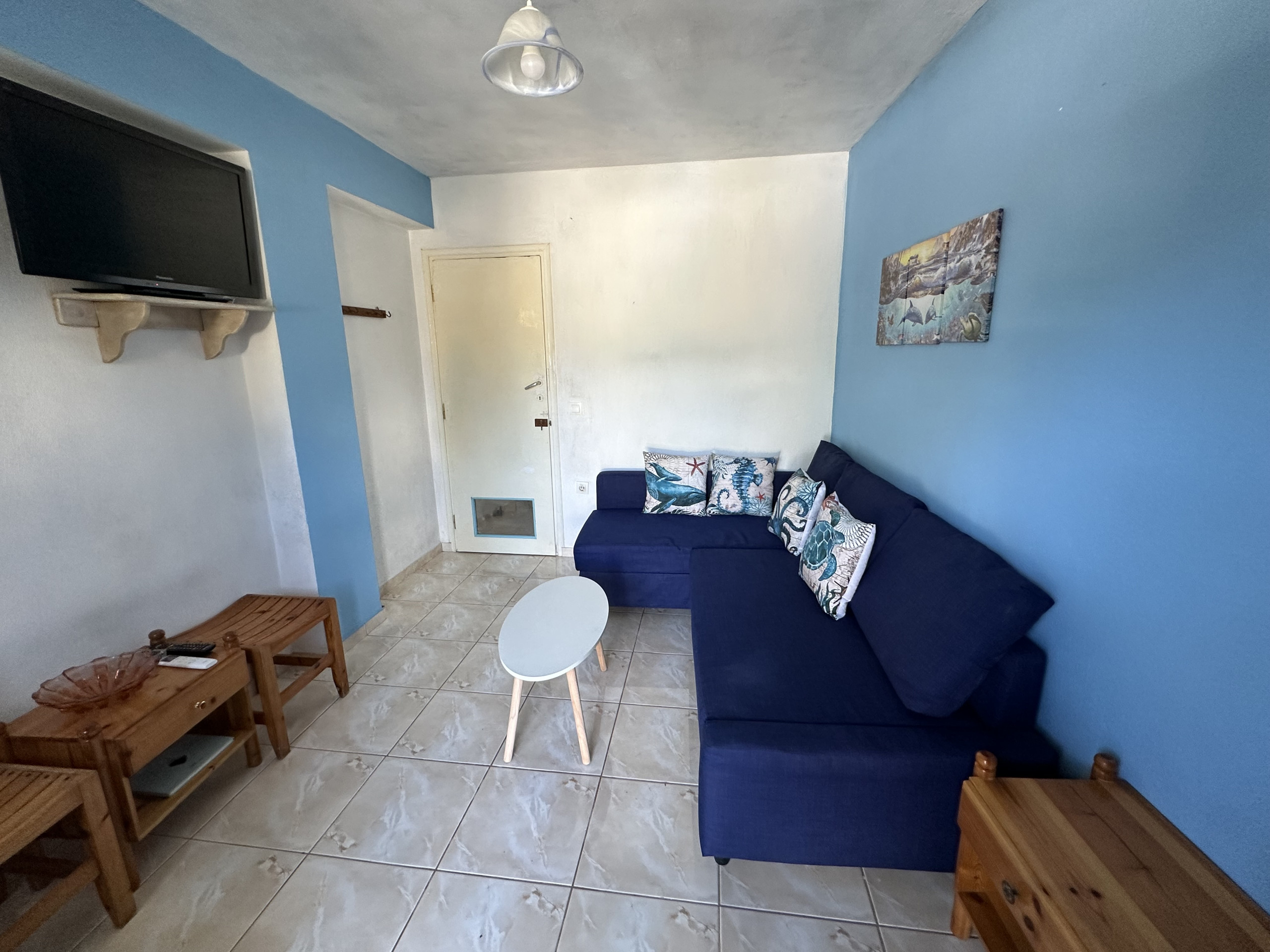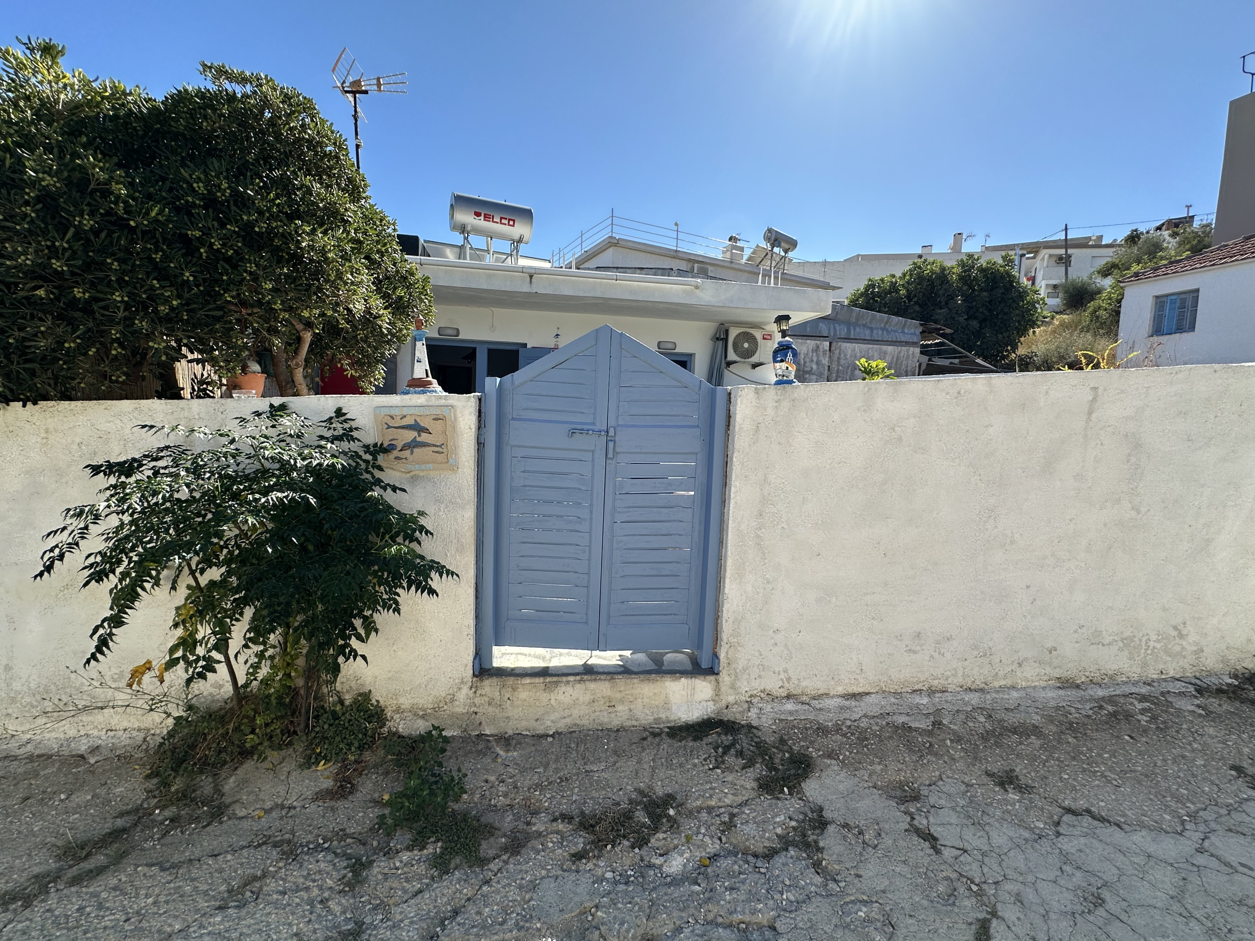 Wonderful seaside house with 2 bedrooms, located in the area of Ftelia, with direct access to the sea, on the other side of the road. The house has a big shady terrace with views to sea and to town. Living room with open plan kitchen.