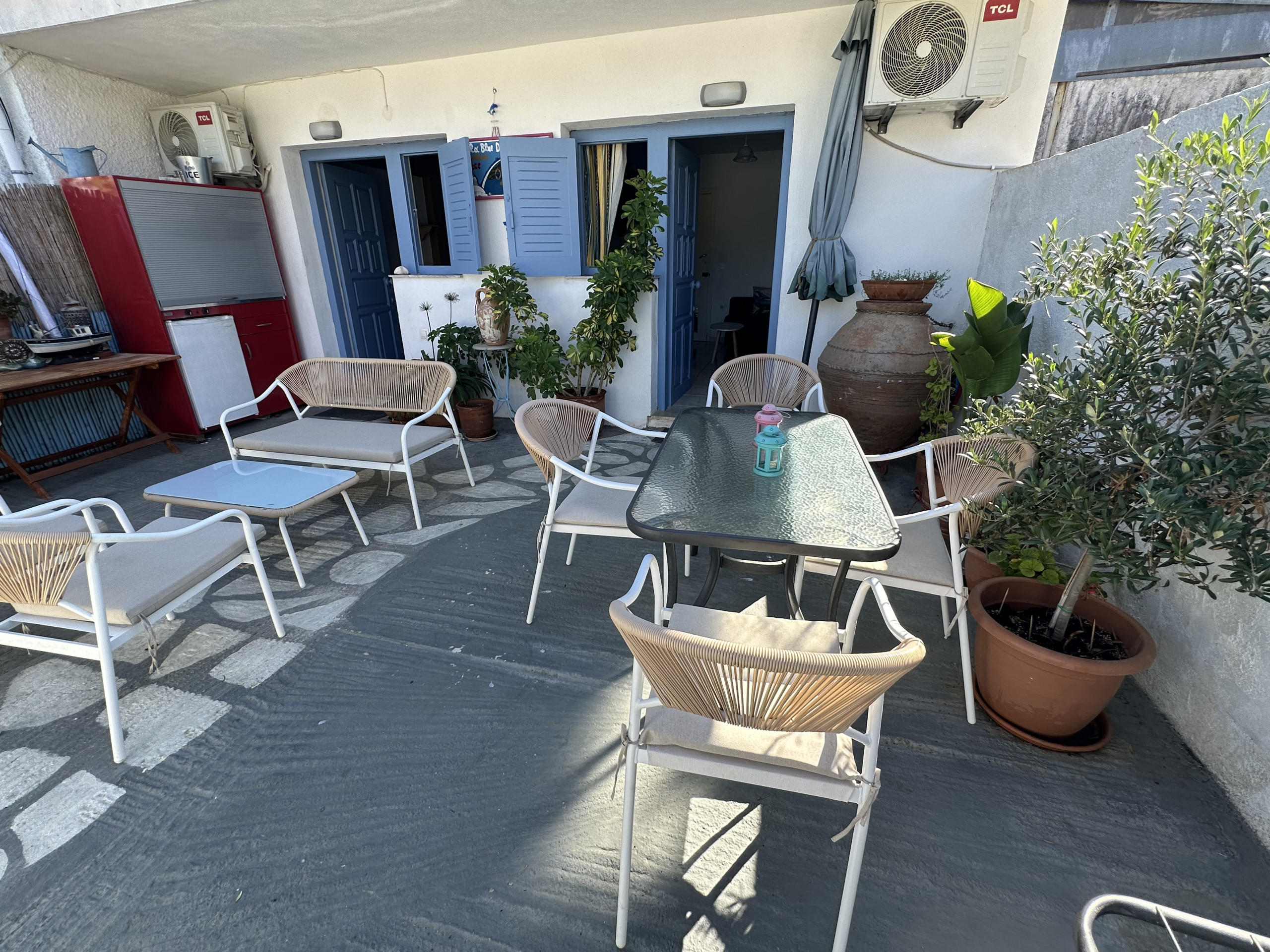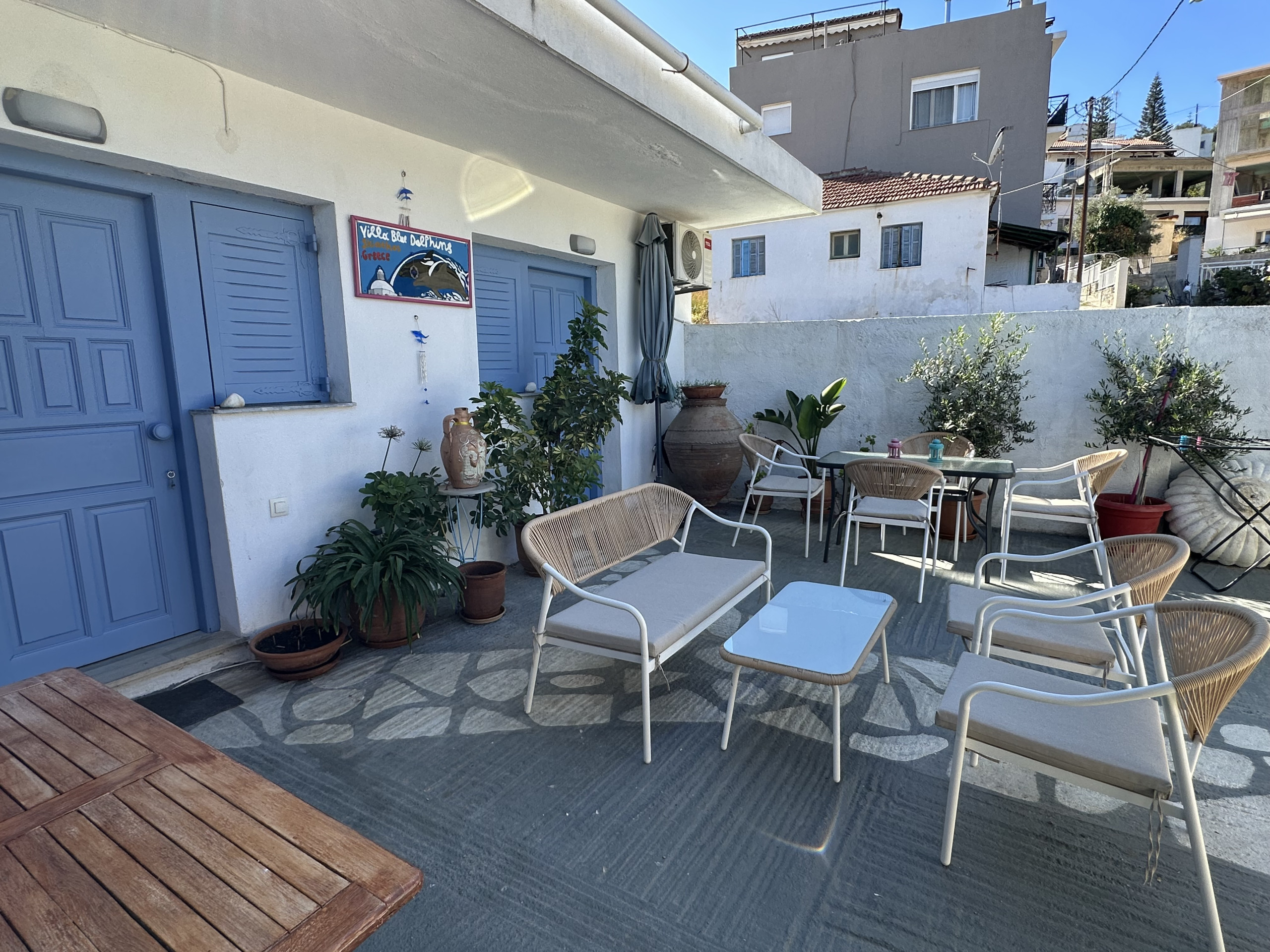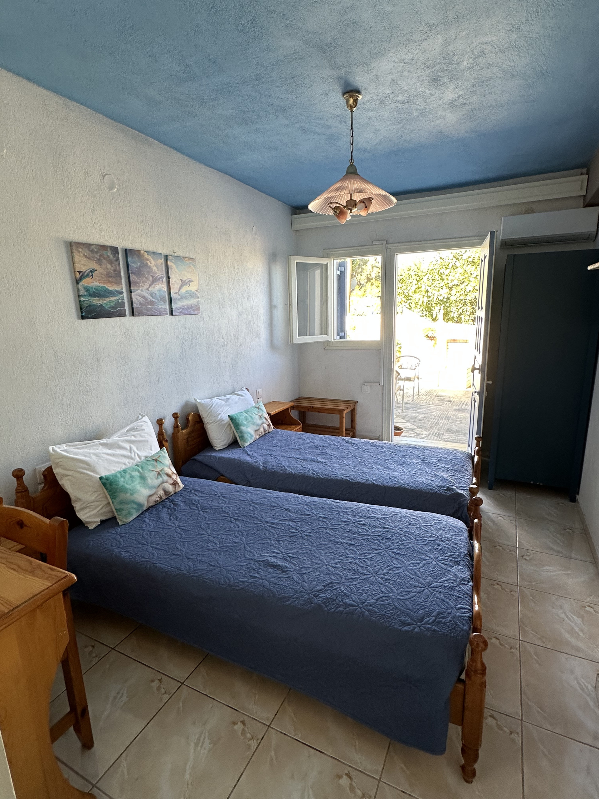 This simple and sweet place is ideal because it is very near the center of town, but located in a quiet area. The courtyard is wonderful, you will spend most of your time here. The 2 bedrooms have twin beds, and it is possible to add a third bed in each room, so it can sleep up to 6 people. Each room has it's own door to the terrace. It is within walking distance of the first beach, the bus stop and a supermarket. You can park next to the house. There is a kitchenette and a bathroom with shower.