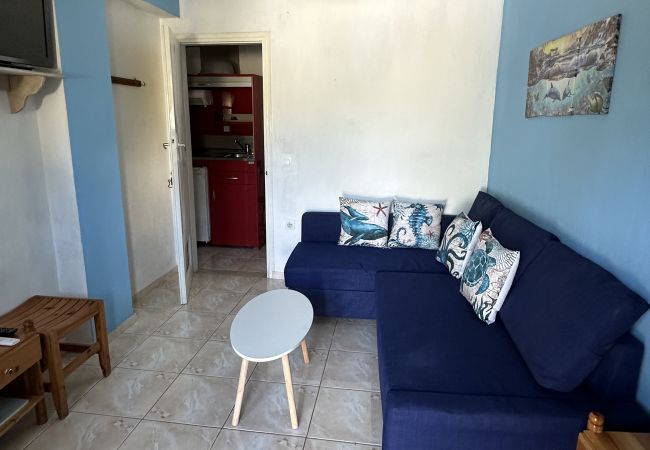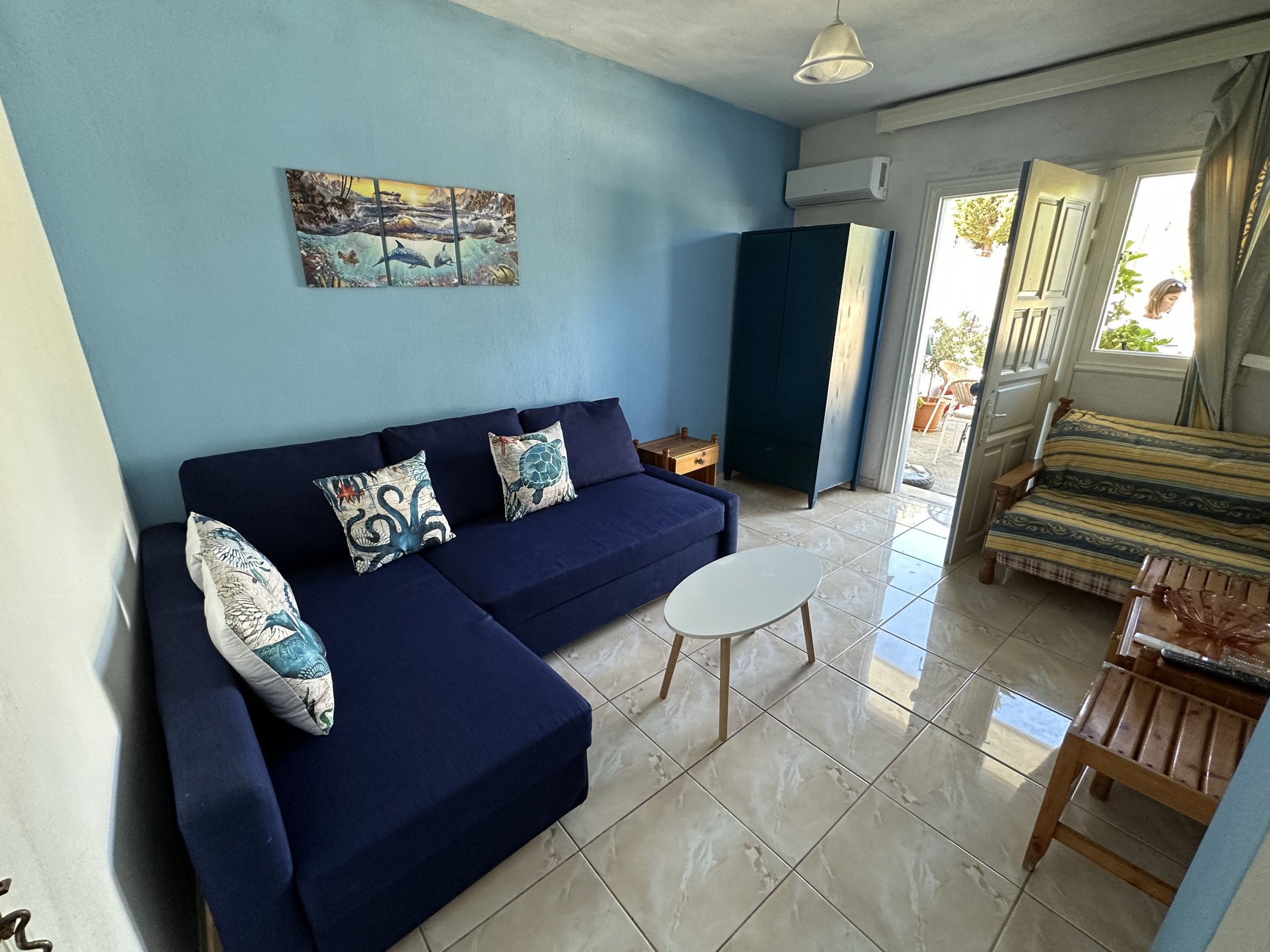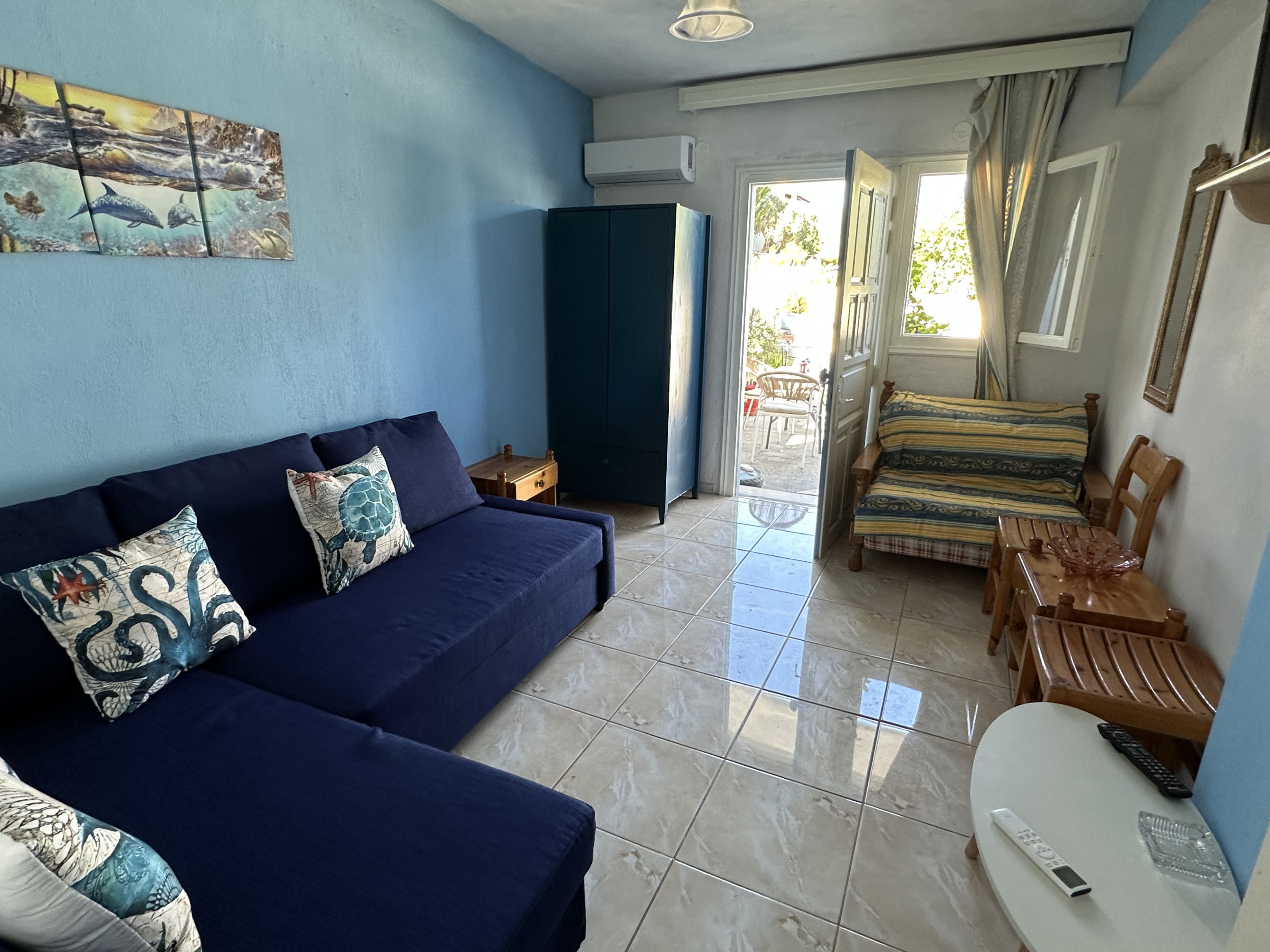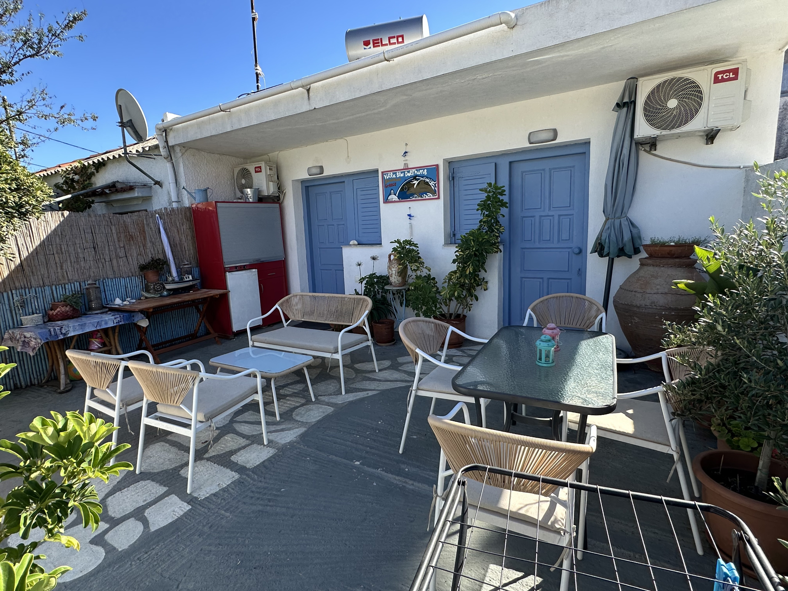 This simple and sweet place is ideal because it is very near the center of town, but located in a quiet area. The courtyard is wonderful, you will spend most of your time here. The 2 bedrooms have twin beds, and it is possible to add a third bed in each room, so it can sleep up to 6 people. Each room has it's own door to the terrace. It is within walking distance of the first beach, the bus stop and a supermarket. You can park next to the house. There is a kitchenette and a bathroom with shower.