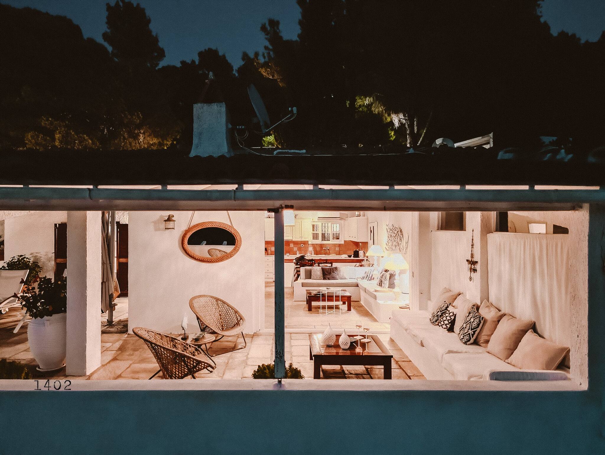 Beautiful and light house on a hill side with stunning theater-like views. The villa has a big terrace with various sitting areas and has a small pool.