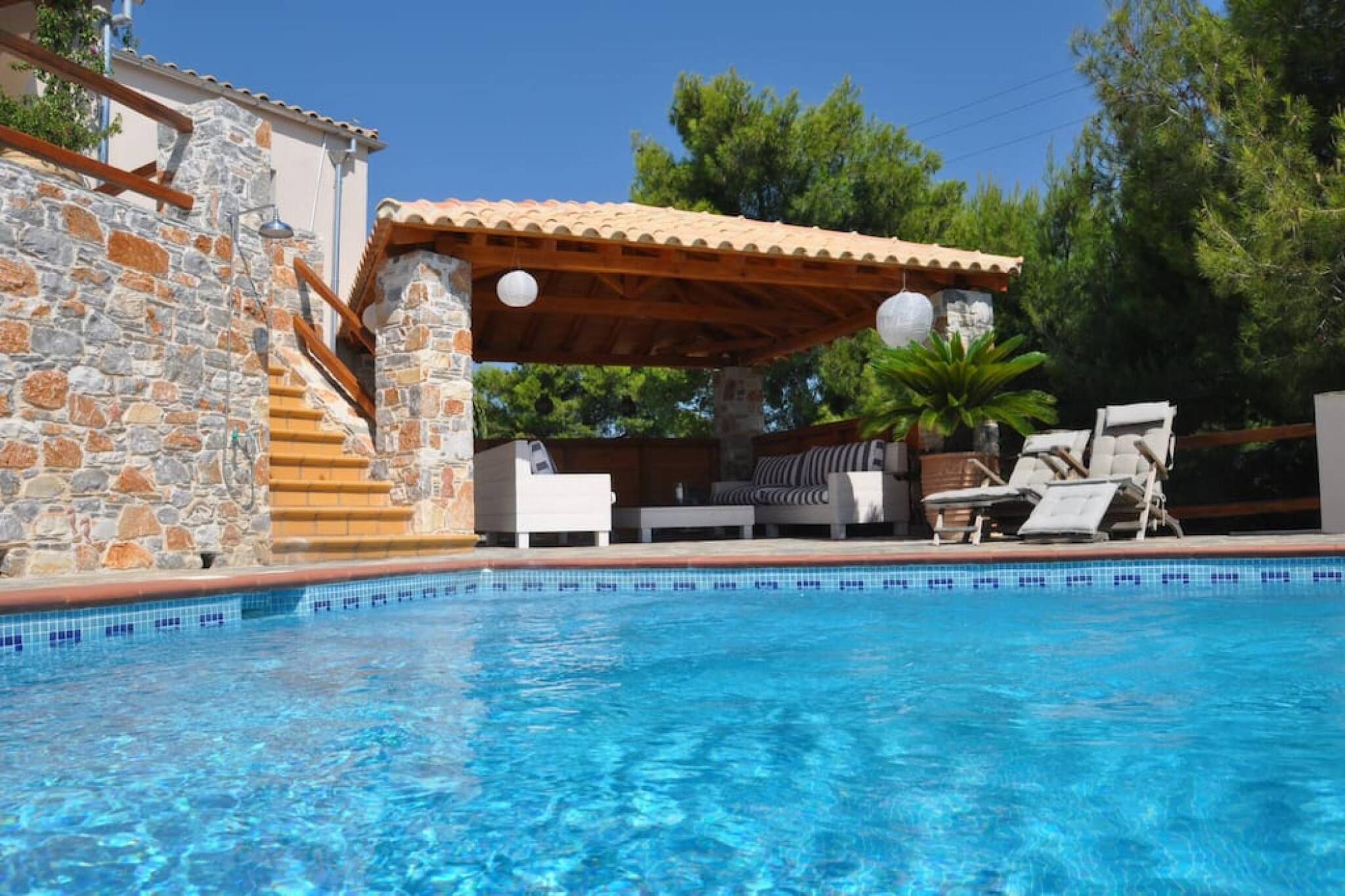 This peaceful villa is set in a lovely green environment of pine trees and bushes, with enjoyable sea views. It is located between the beaches of Kanapitsa and Tzaneria (Nostos). It is composed of 2 layers. The upper villa has 3 bedrooms and 2 bathrooms, a new big fully equipped kitchen, and a living room. The downstairs villa has 2 bedrooms, bathroom and living room with open plan kitchen. Both have spacious terraces with sea views. They are connected via an external staircase and are private.1 review