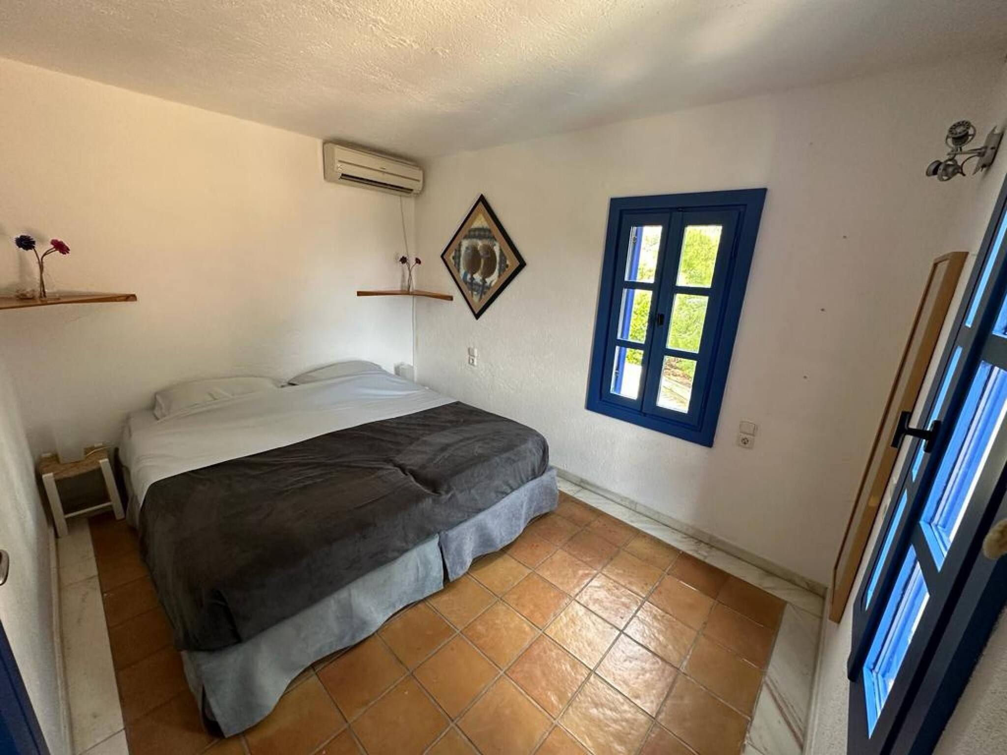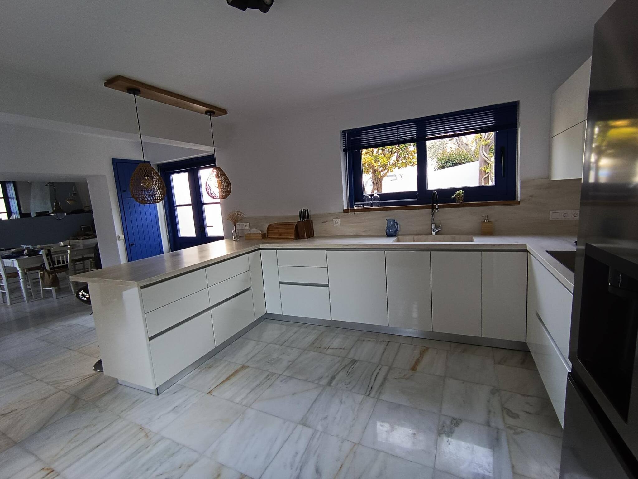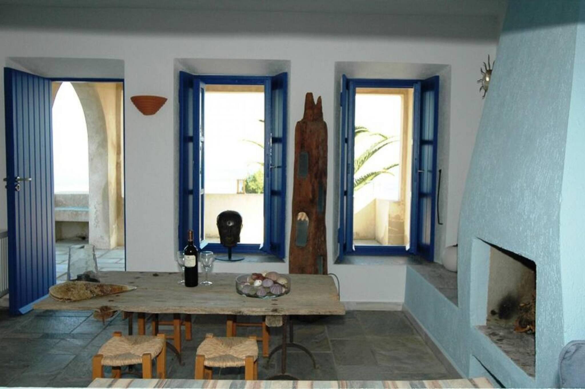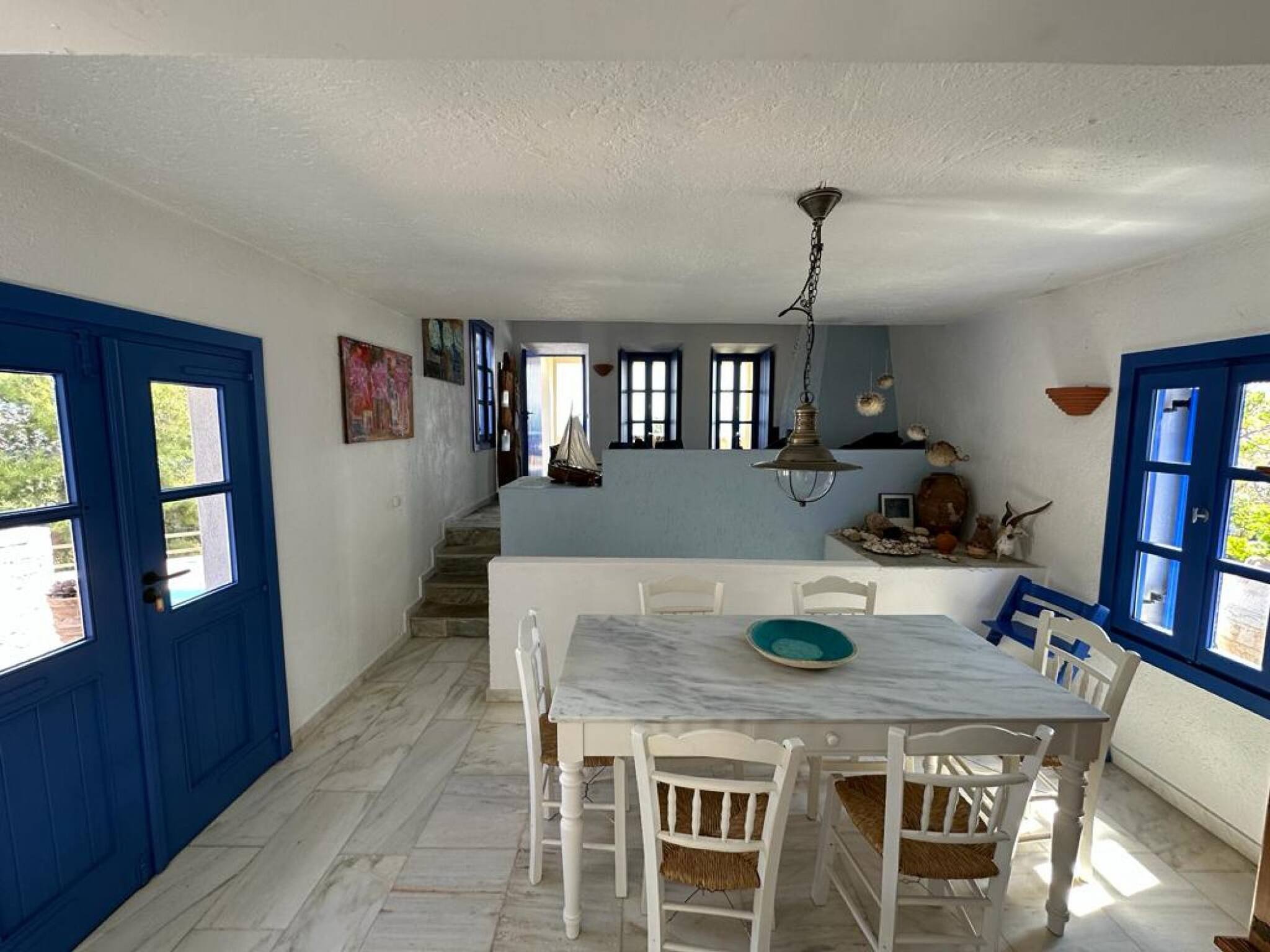 Modern design with a touch of traditional white and blue. Perfect rental for big families, with large outside areas with an amazing view to the sea, the island and the town. There are 4 bedrooms and 3 bathrooms