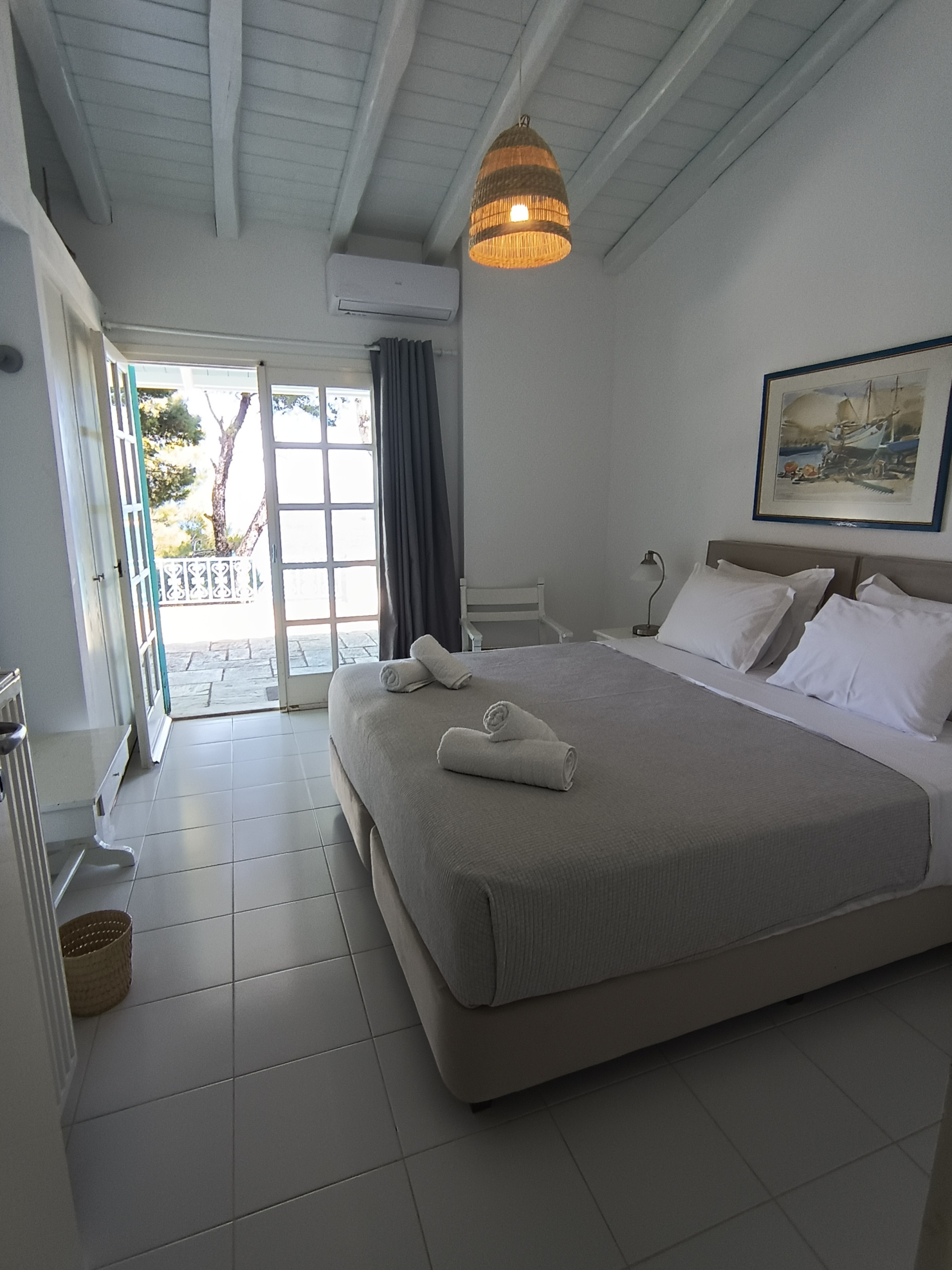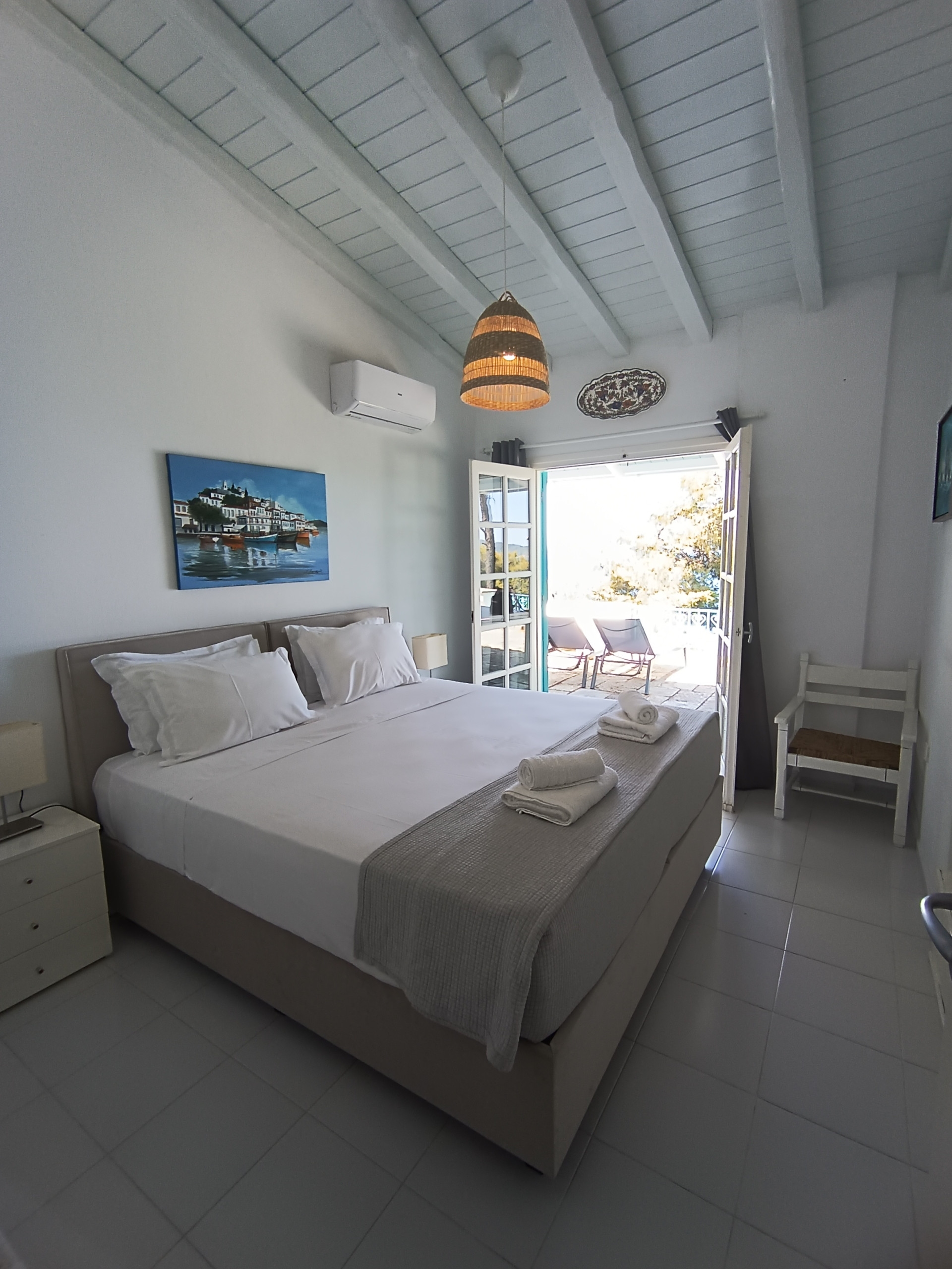 Stunning views, sea breeze and a semi-private beach at your feet. Start dreaming about your most relaxing stay in Skiathos ever! Villa Eirini is set up like a little village around a piazza, with all private spaces with private entrances. Each bedroom has a door from the spacious terrace and access to a bathroom. In the middle is the area with the living room and kitchen. Every time you look outside you will be struck with the amazing view, the colors, the light! The beating heart of this property is the outdoors area, with many different corners to find private time, but of course the big dining area on the side where everyone can enjoy their meal together. The area is very peaceful and the starry nights will amaze you. There is one bedroom with 4 single beds, a terrace and a bathroom with a bathtub.