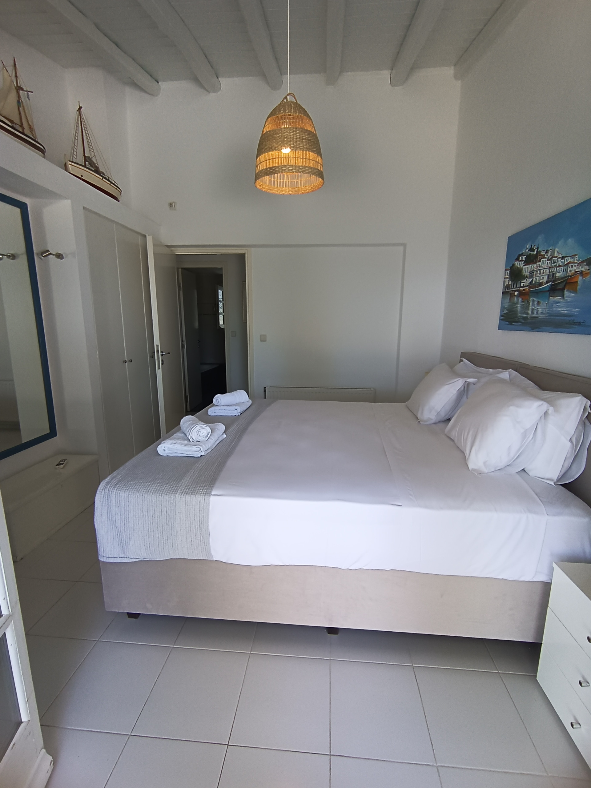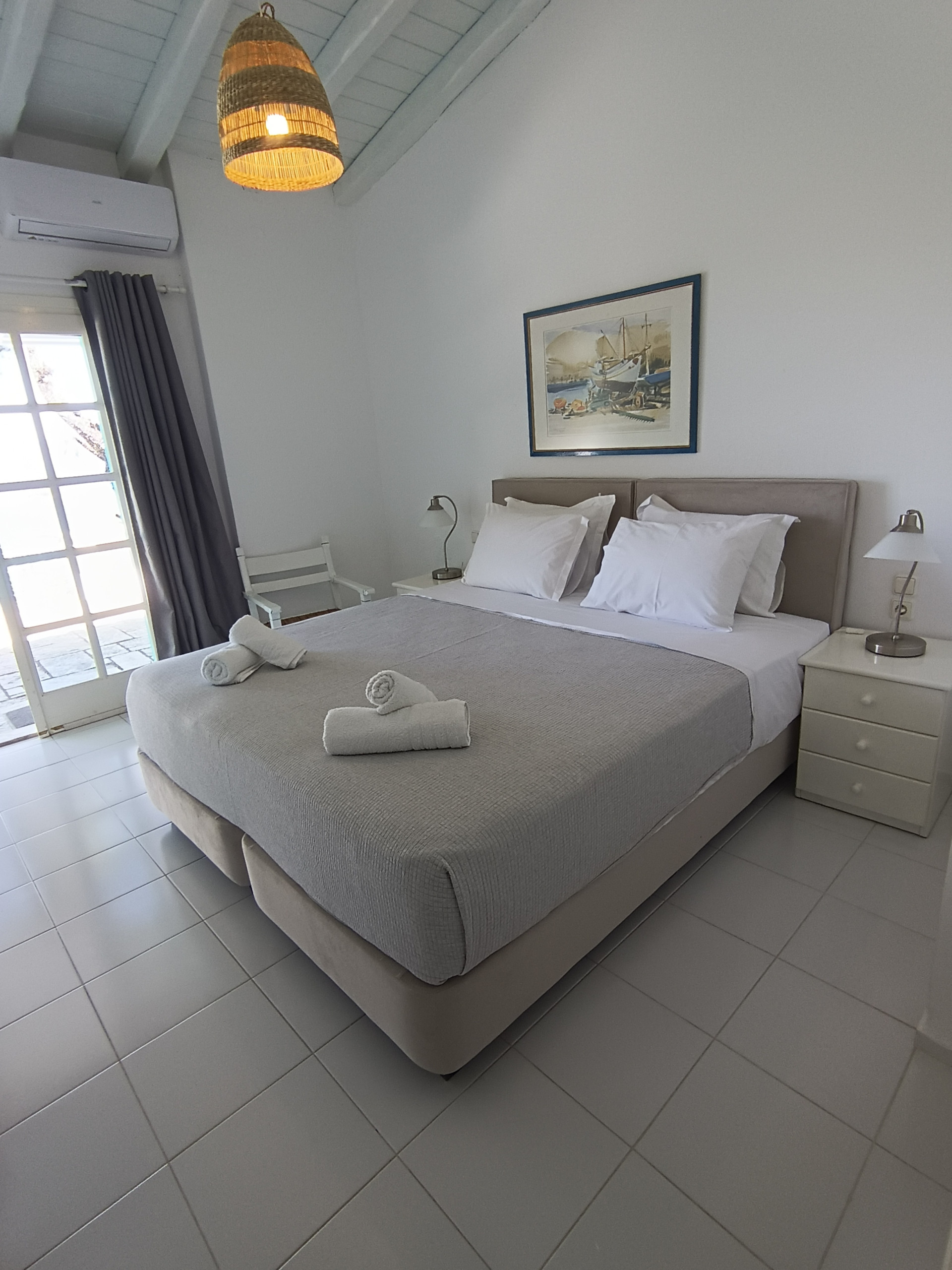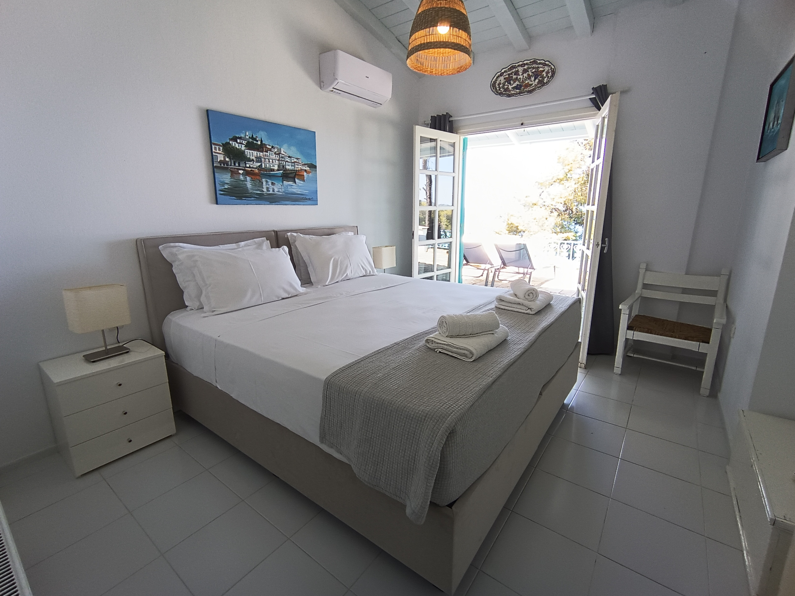 There are 2 bedrooms with double beds and ensuite bathrooms. The villa can sleep 10 people in total.