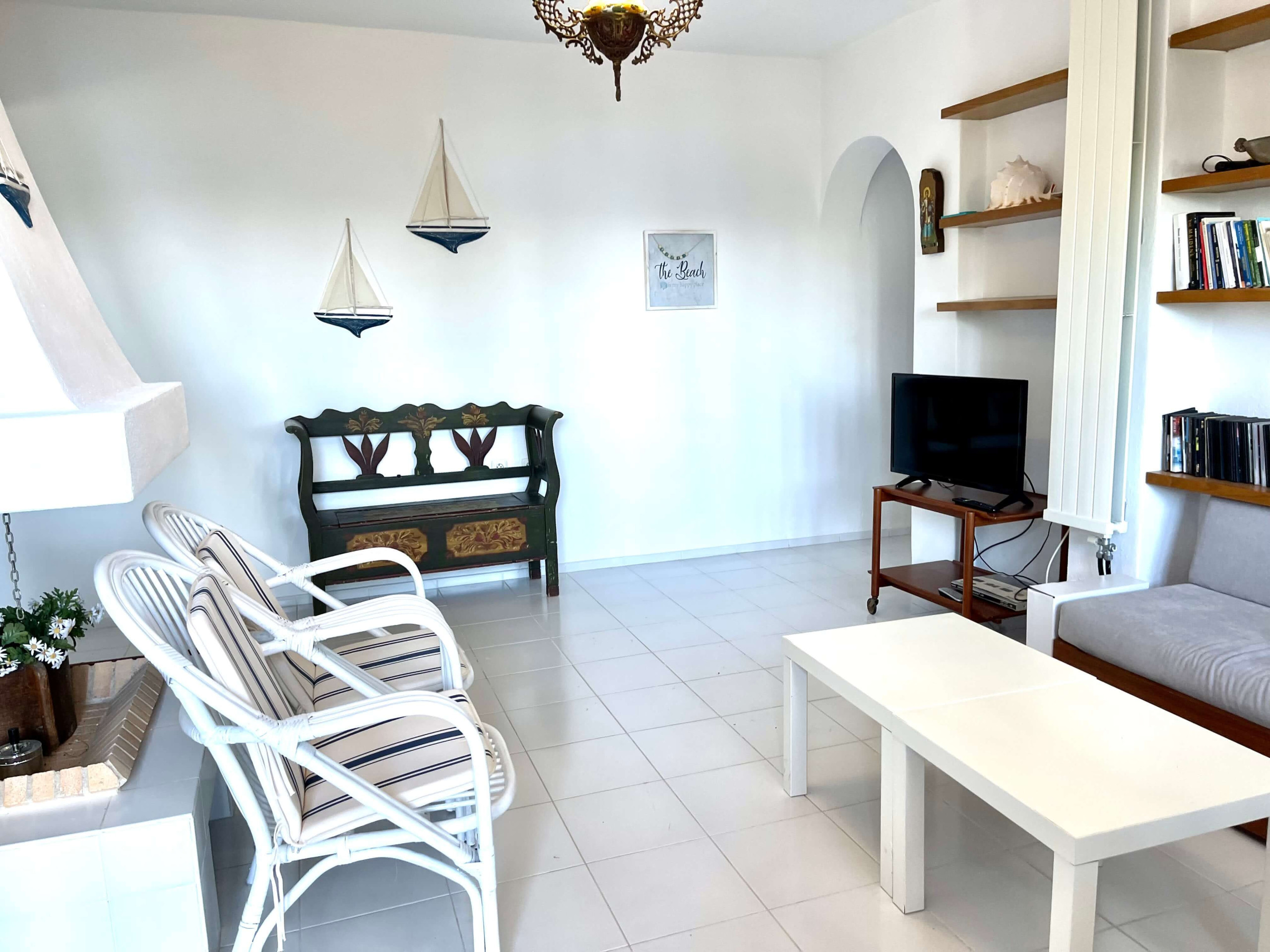 This peaceful villa is set in a lovely green environment of pine trees and bushes, with enjoyable sea views. It is located between the beaches of Kanapitsa and Tzaneria (Nostos). It is composed of 2 layers. The upper villa has 3 bedrooms and 2 bathrooms, a new big fully equipped kitchen, and a living room. The downstairs villa has 2 bedrooms, bathroom and living room with open plan kitchen. Both have spacious terraces with sea views. They are connected via an external staircase and are private.